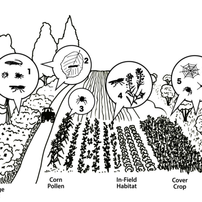 Digital illustration that conveys the impact of multiple niches supporting biocontrol for the Managing Pests Publication of Wild Farm Alliance. Catchafire volunteer illustration pr