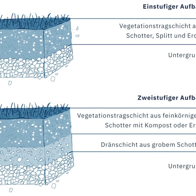 Two digital illustrations of a gravel lawn soil profile for Netzwerk Bluehende Landschaft (Mellifera e.V.) to bring a recommended action for the creation of a gravel lawn on their
